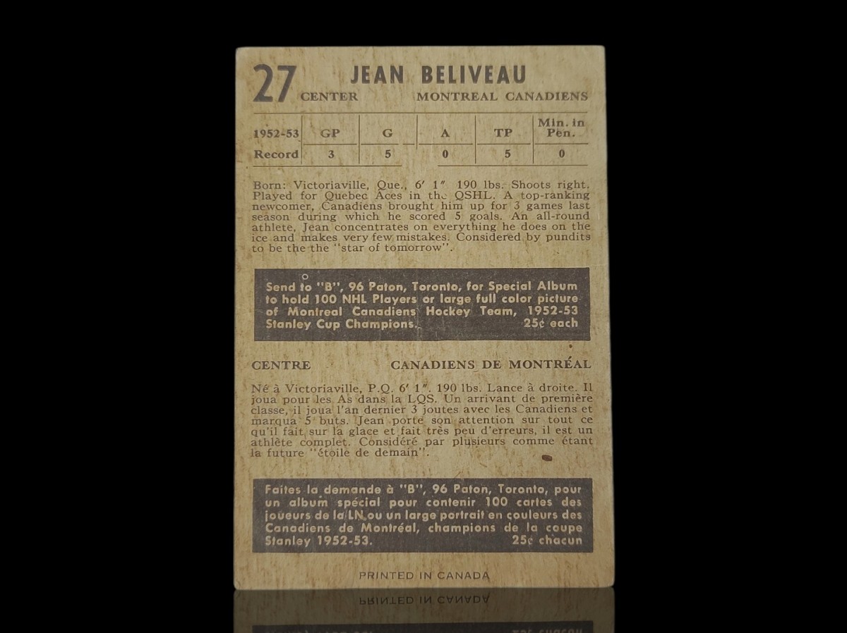 Set of 1953 Parkhurst hockey cards, Jean Beliveau rookie card