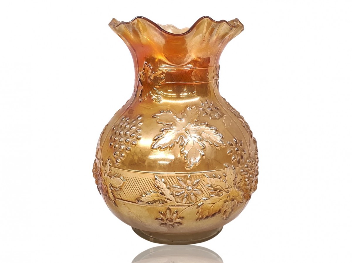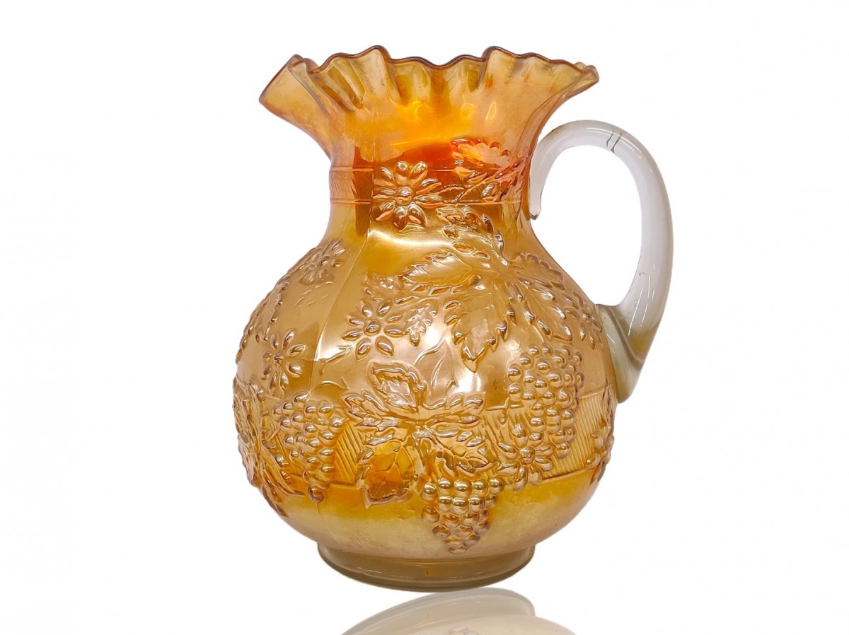 Vintage marigold carnival glass pitcher, dish
