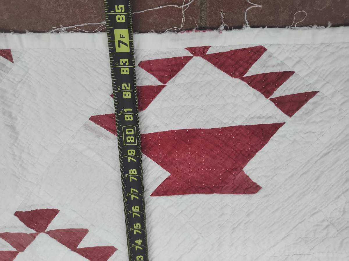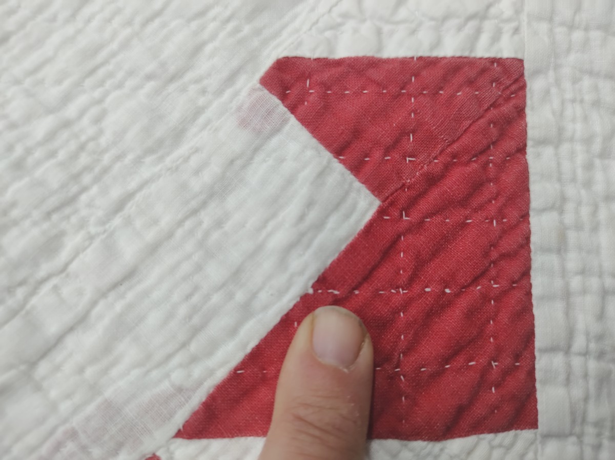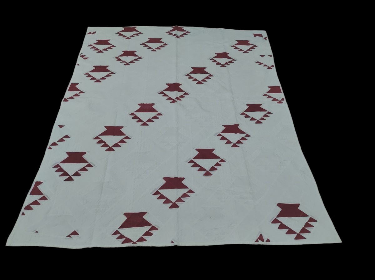 Handmade quilt with red geometric pattern.