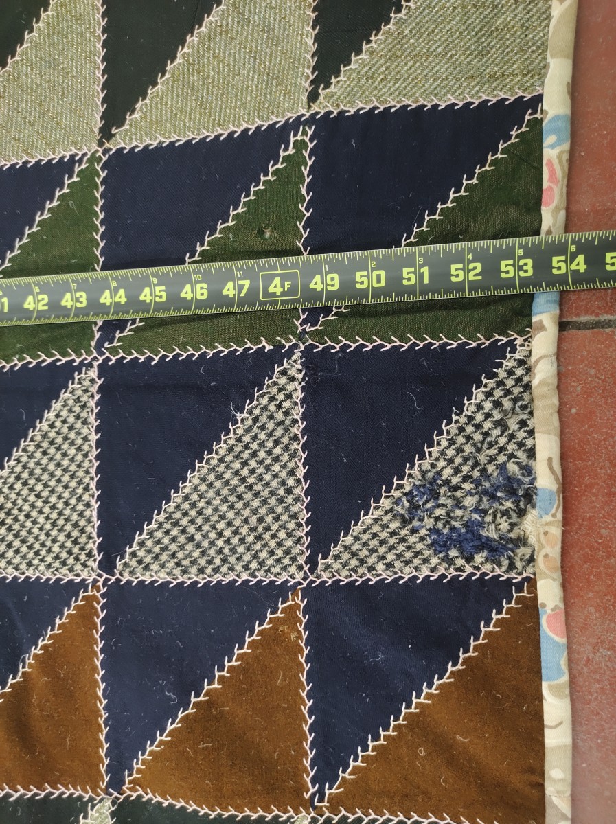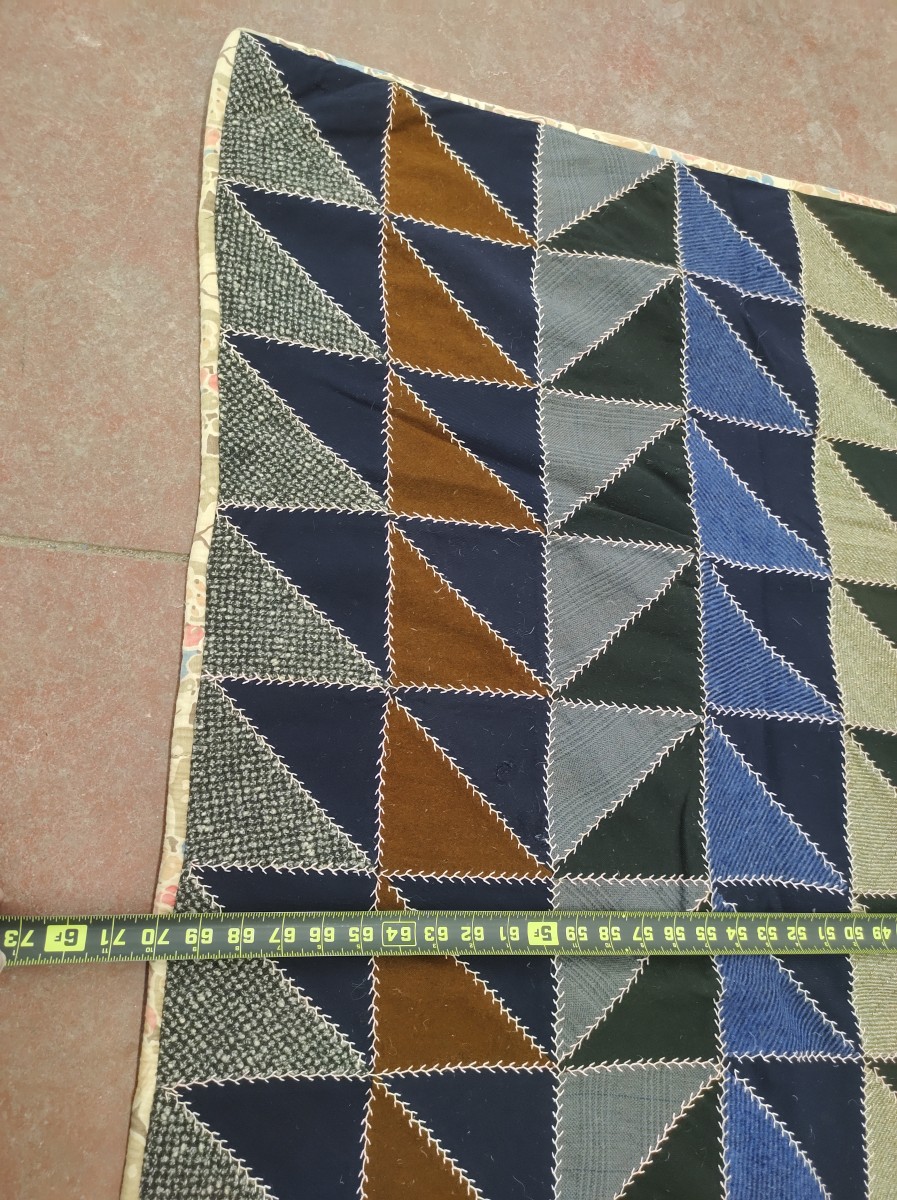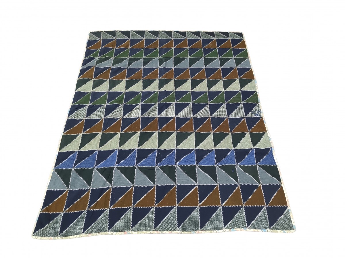 Handmade quilt with red geometric pattern.
