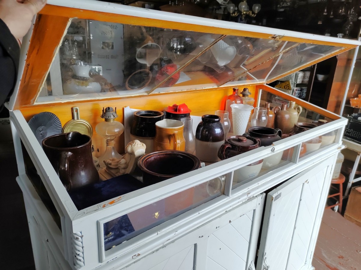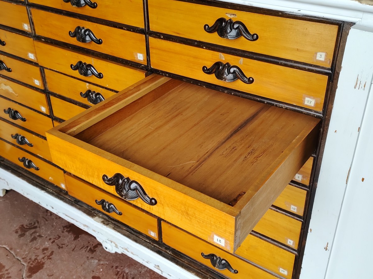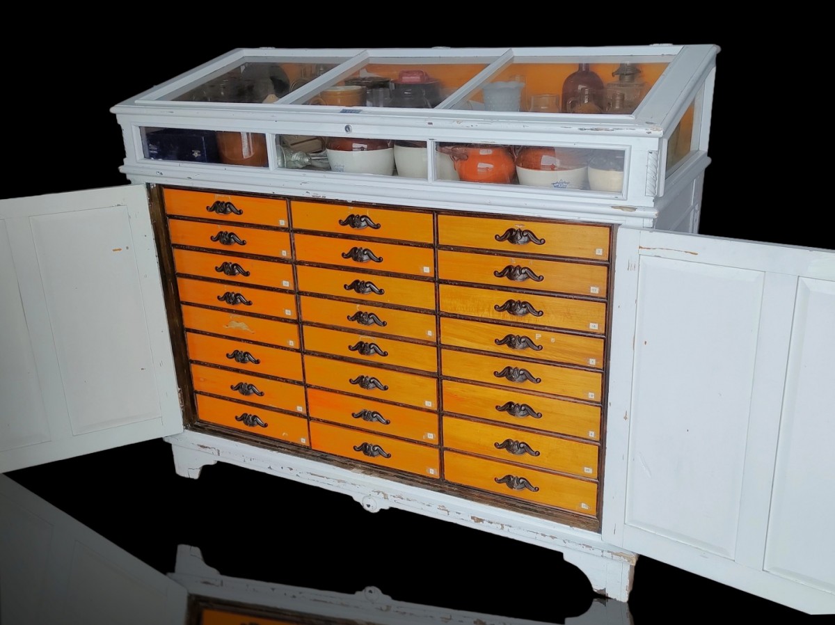 Accueil-Antiquité-Superbe meuble présentoir avec multiple tiroirs, comptoir-classeur de magasin général